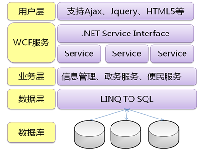 系統(tǒng)技術(shù)架構(gòu)采用基于WCF的SOA架構(gòu)。SOA架構(gòu)設(shè)計(jì)目標(biāo)以統(tǒng)一性、簡(jiǎn)潔性和透明性為集成,力求達(dá)到統(tǒng)一服務(wù)調(diào)用,統(tǒng)一服務(wù)發(fā)布和統(tǒng)一服務(wù)配置。WCF具有開(kāi)發(fā)的統(tǒng)一性、能夠?qū)崿F(xiàn)多方互操作、提供高效的安全與可信賴度和支持多支消息交換模式等優(yōu)點(diǎn)。使用WCF實(shí)現(xiàn)SOA,可以利用WCF的靈活性,把業(yè)務(wù)層封裝,發(fā)布為Web服務(wù)。這樣可以降低系統(tǒng)的耦合度,加大對(duì)未知業(yè)務(wù)的擴(kuò)展性。如下圖所示: